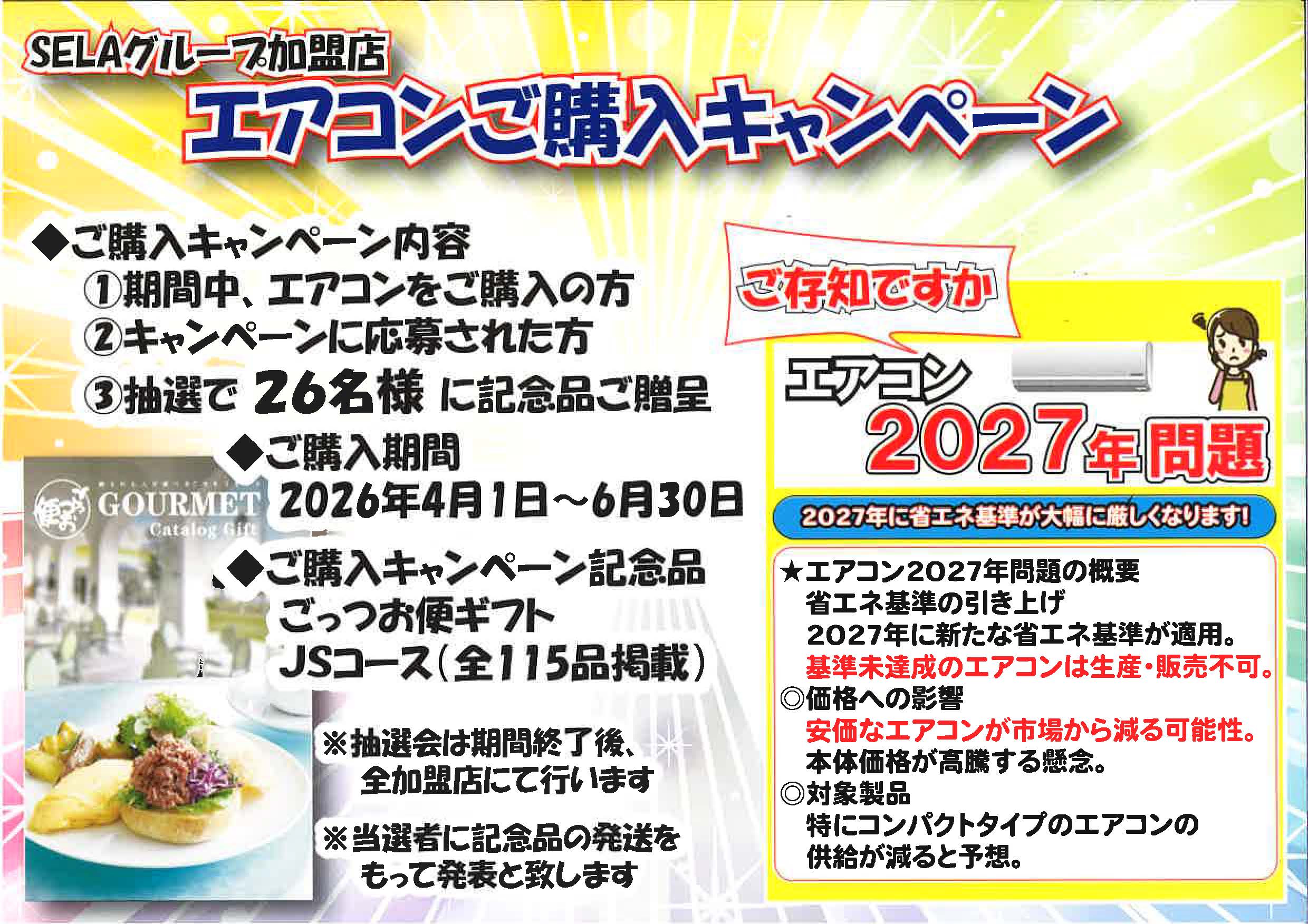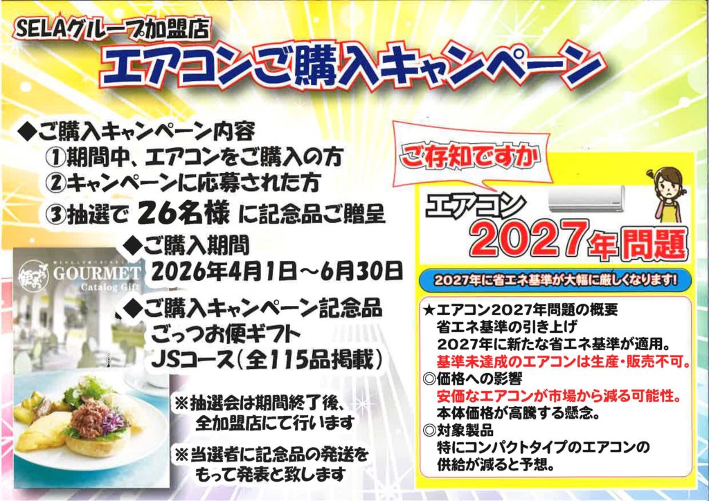 STAFF BLOG エアコンご購入キャンペーン! 2026.04.11 今なら、まだ、昨年モデルの特価商材もございます。 暑くなる前の取り付けがお得です! Tweet Share Hatena 前の記事 次の記事